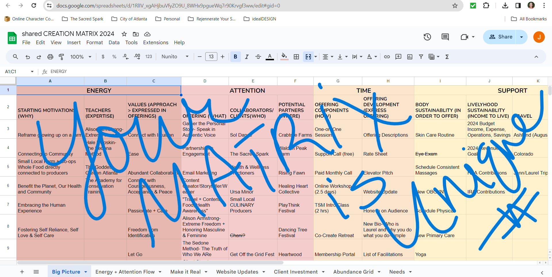 I’ll capture all of it in a Google Sheet called a Matrix. This will be where we’ll weave together all the WHAT: dreams, projects and desires with WHEN: goals to put it out in the world by being real about the HOW: that sharing looks. It’s pretty linear and a great system to track all of it including your progress. It’s your home base for shared creation with me. It’s a living document that we can update as the pathway is built, walked and created with each step. Your matrix lives in a shared Google Drive.